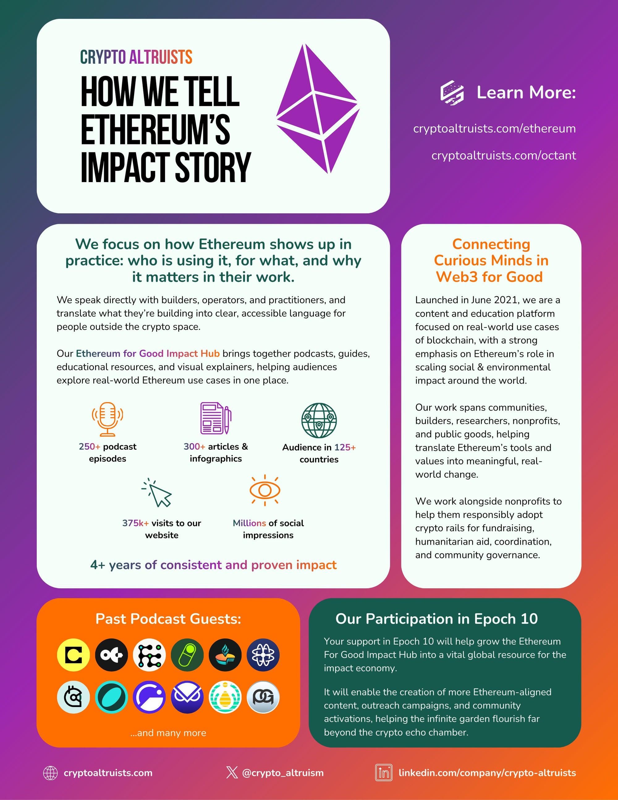 Over the past few years, we’ve focused on making Ethereum easier to understand and easier to use for people working on social and environmental challenges. Most of our work has been about sharing clear information, building useful resources, and supporting nonprofits and impact teams who are navigating this space for the first time. With support from Epoch 10, we'll keep expanding the Ethereum for Good Hub and improving onboarding for the impact economy.