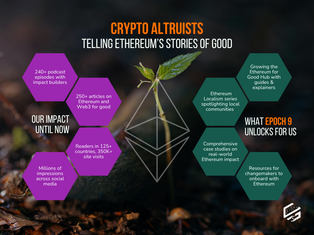 For us at Crypto Altruists, this support will help unlock new formats, deepen our coverage of impact-driven projects, and expand our storytelling, bringing more visibility to those building Ethereum for good.