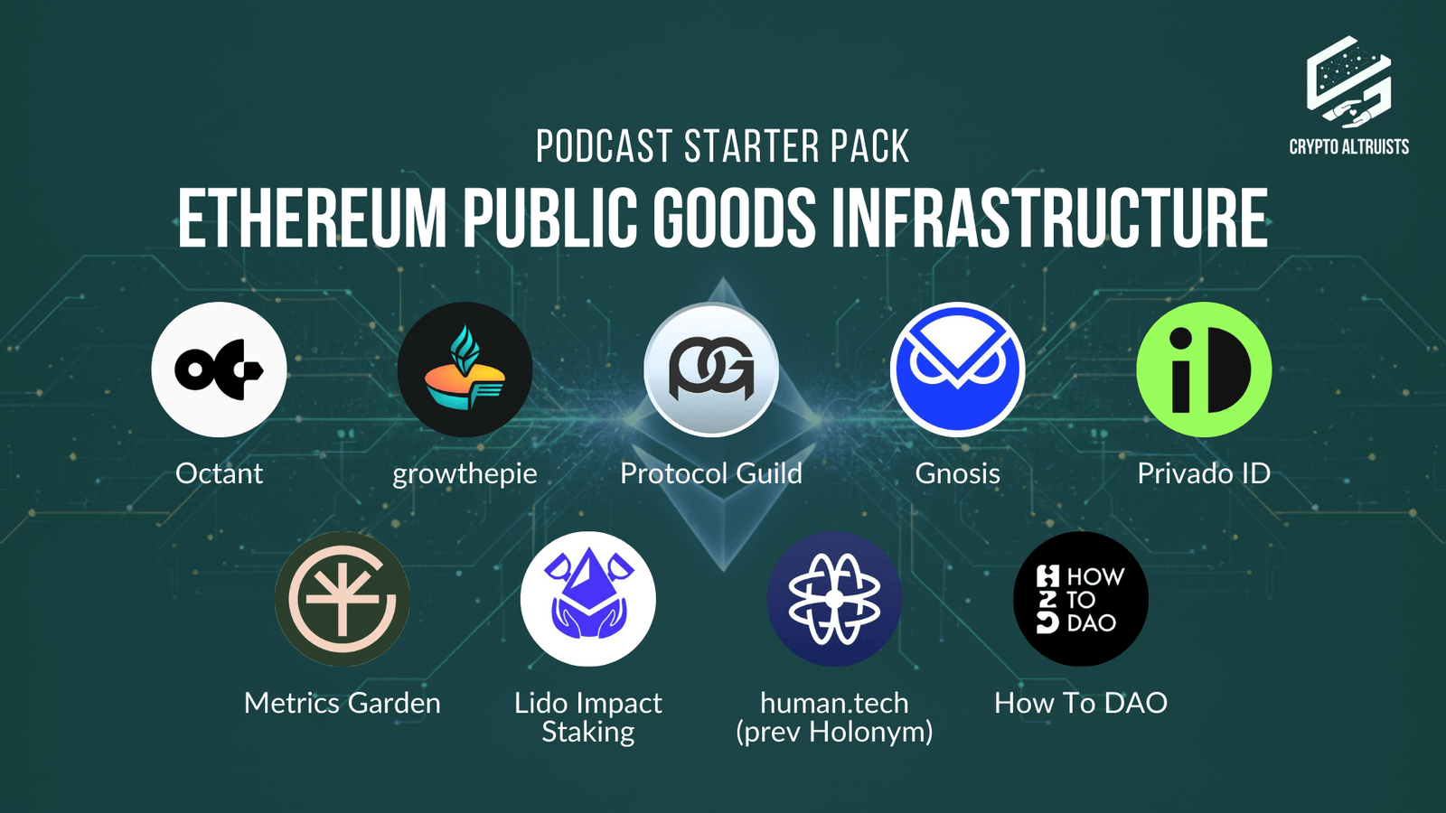 - 📦 Crypto Altruists Starter Pack: Ethereum Public Goods Infrastructure: A curated collection of podcasts on Ethereum’s public goods stack featuring Octant, growthepie, Protocol Guild, Gnosis, Privado ID, and more. It is your essential guide to how Ethereum builders are funding, growing, and sustaining the digital commons.