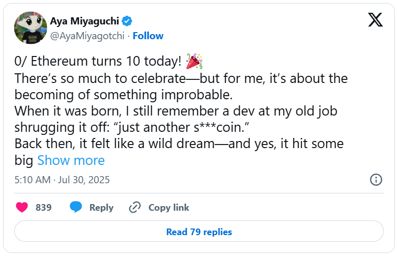 With the anniversary, there’s been a lot of reflecting on Crypto Twitter too, with threads like these from Aya Miyaguchi, President of the Ethereum Foundation, sharing personal perspectives on Ethereum’s journey so far.