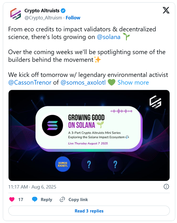 In upcoming installments, we’ll continue to surface stories of how Solana’s architectural advantages are being applied to ecological, social, and community-minded initiatives, revealing what this fast-moving ecosystem can offer for building regenerative, scalable solutions.